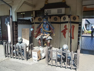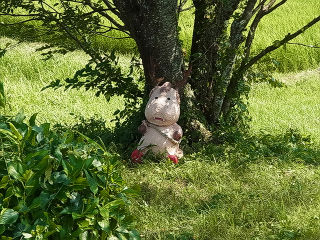 | ホームに設置された本多忠勝像です。大多喜藩の初代藩主で、徳川四天王の一人としてその猛将ぶりは日本中に知られています。 | 駅脇の草原に設置されたムーミン像です。こんなところに置かれて、盗難の被害に遭わないか少々心配です。 | |