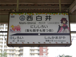| 梨の生産量国内一位の千葉県でもトップクラスの収穫量誇る白井市。駅名標最上部には名産の梨があしらわれています。 | 競馬学校最寄の当駅、最上部の梨の他、最下部には馬、さらには人気競馬ゲームのキャラクターがあしらわれています。 | |