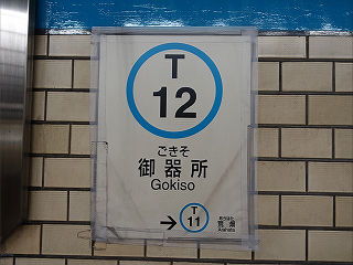 | 縦型の駅名標です。駅ナンバー表示が主目的のようで、通常のものよりサイズは小さく、自駅と次停車駅のみ記載されています。 | 同じく縦型の駅名標です。既設が破損したのか、紙に印刷したものがテープで留められていました。 | |
