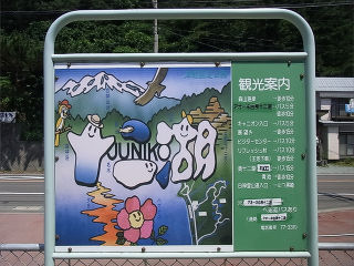 | 十二湖同様、イラスト中心の観光案内看板です。一応、イラストは説明文と対応しています。 | 名所というよりは、イベントを全面に押し出した観光案内看板です。 | |