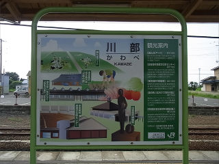 | 木造と同時期に整備された駅名看板です。文字、イラストともに細かく、看板というレベルを超越しています。 | イラストを全面に押し出した、なんともマンガチックな観光案内看板です。右下に描かれた地図はすっかり存在が消えています。 | |