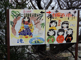 | 駅前のタブノキを紹介する看板です。樹齢700年とも言われ、観光列車「四国まんなか千年ものがたり」のデザインにも採用されています。、 | 映画「書道ガールズ」のロケ地を記念して設置された看板です。2010年の公開当時若手だった出演者も、すっかり中堅どころとなりました。 | |
