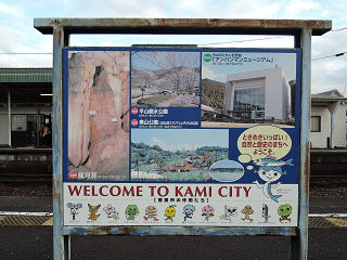 | 自立型の名所案内看板です。名所の写真がモザイク風に配置されています。 | 前述の看板裏面。下部には地元出身の漫画家やなせたかし氏による香美市のキャラクターが勢ぞろいです。 | |