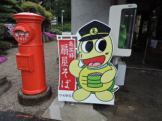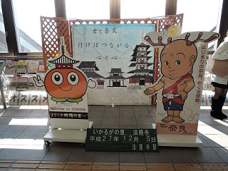 | 併設された蕎麦屋のキャラクター「かめ駅長」。特にグッズなどは発売されていないようです。 | 斑鳩町のキャラクター「パゴちゃん」。柿と仏塔(パゴダ)を組み合わせた姿で、身長2メートル、体重80キロの男の子です。 | |