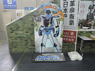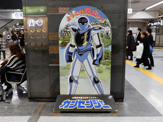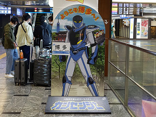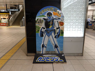 | JR西日本の看板。続いてご紹介するのは、500系新幹線をモチーフとした山陽新幹線のキャラクター「カンセンジャー」です。背景には駅周辺の名所、特産品があしらわれています。 | ||