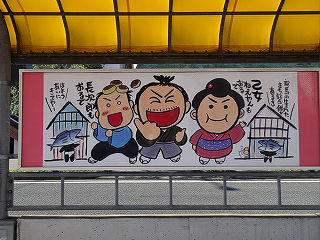 | 中国・四国地方の看板。続いてはとさでん交通の停留所に設置された、地元出身漫画家のイラスト入り名所案内看板をご紹介します。。 | ||