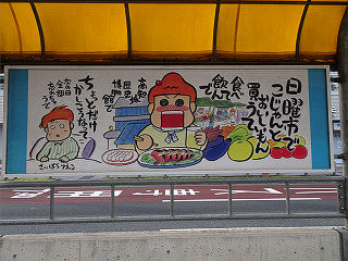 | 伊野方面乗場の看板。日本百名城にも数えられ、江戸時代の天守が残る高知城は、県民の誇りなのでしょうね。 | 後免町方面乗場の看板。300年以上の歴史を誇る日曜市は約500店が出店し、農作物や生活雑貨など様々な商品が販売されています。 | |