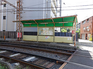 | 阪堺線浜寺駅前方面乗場。上屋のない細いホームですが、後方に待合所が設置されています。 |
