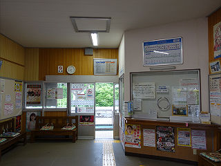 | 切符売場と改札口。午前中のみ委託の窓口が営業しています。 | FRP製の椅子が設置された待合室。頭上にはSL時代の写真が掲示されています。 | |