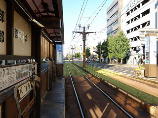 | 1系統乗場全景。併用軌道上の電停です。ホームには、横断歩道からバリアフリー対応のスロープで連絡します。 |