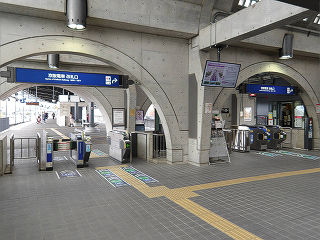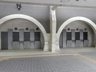 | 2階の切符売場。タッチパネル式の券売機が2台と定期券発売機が1台設置されています。 | 1階の東側の臨時切符売場らしきスペース。いつ頃まで使用されていたのでしょうか。 | |