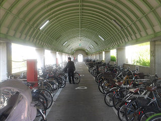 | 駅前の駐輪場。半円形の屋根が小洒落た雰囲気を演出しています。 | 切符売場。券売機が2台と定期券発売機が3台設置されています。 | |