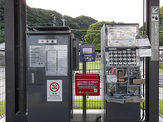 | 駅入口。西からは階段、写真奥の東からはバリアフリー対応のスロープが設置されています。 | 切符売場。簡易型の券売機が1台。ビニール製のカバーは灰対策なのでしょうか。 | |