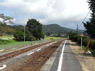 | 列車は国道284号線と東に並走し、折壁に到着します。旧室根村の代表駅で、周囲は小さいながらまとまった集落を形成しており、沿線最高峰である室根山は当駅が入口となっています。 |