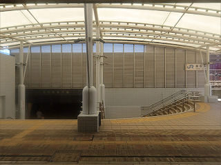 | 正面にあたる南口。入口のテント式上屋は羽を広げた「鷹」をイメージしたものでしょうか。壁面には鷹取工場を偲んで蒸気機関車のプレートが埋め込まれています。 |