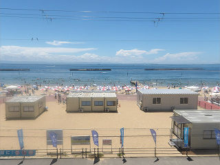 | 列車は高架を下りて南西に進み、瀬戸内海を見て須磨に到着します。駅の南には関西でも有数の海水浴場である須磨海水浴場が広がり、シーズン中は多くの海水浴客で賑わいます。 |