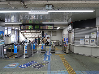 | 改札口。改札機は5台。ラッシュ時の混雑緩和のため、改札機は前後にずらして配置されています。 | 下関方面。ホームは島式1面2線。跨線橋が西端に位置するため、ラッシュ時の混雑に拍車をかけています。 | |