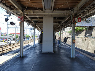| 改札口。改札機は4台。吹き抜けと灯り取りの大きな窓が開放的な雰囲気を演出しています。 | 下関方面。ホームは島式1面2線。列車線と山陽電鉄に挟まれています。 | |