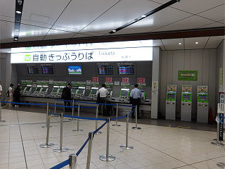 | 切符売場。指定席券売機が12台と受取機が3台。日中は長蛇の列も、早朝は閑散としています。 | 改札口。改札機は8台。発車案内は少し進んだ先に設置されています。 | |