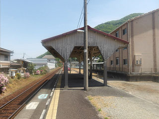 | 佐古方面。ホームは1面1線。上屋の構造から、かつては交換駅だった様子が窺えます。 | 佃方面。周辺にとりたてて観光資源はありませんが、春になるとホームにつつじが美しく咲き誇ります。 | |