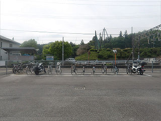 | 駅前の駐輪場。上屋や側壁はなく、白線で区切られるのみです。 | ホームから見た待合所。側壁もなく、ほんの雨露がしのげる程度です。 | |