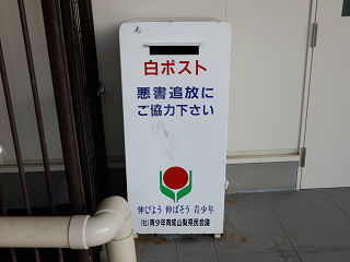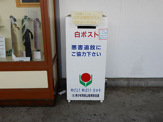 | 待合室に設置された白ポストです。設置主体は青少年育成山梨県民会議ということで、県内全域で白ポストを設置しているようです。 | 駅前に設置された白ポストです。乗降客も少ない無人駅ですが、盗難の心配はないのでしょうか。 | |