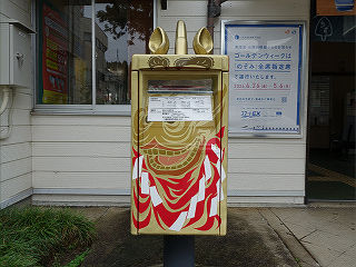 | 地元の民俗芸能「麒麟獅子」のラッピングポストです。虫井神社の麒麟獅子舞は国指定重要無形民俗文化財に指定されています。 | 「ゲゲゲの鬼太郎」作者、水木しげる氏の出身地境港。駅前のポストを彩るのは、一反木綿ではなくハガキに乗った鬼太郎です。 | |