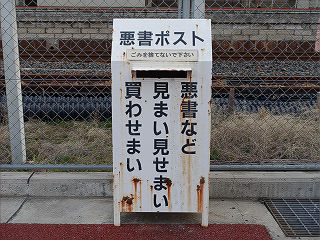 | 駅前に設置された白ポスト。でかでかと「白ポスト」と主張していますが、錆ひるに任せた現状は「茶ポスト」と呼ぶのがふさわしいかと。 | 同じく、駅前に設置された白ポスト。五・七・五の名調子は悪書回収ポストと言うより、川柳投稿ポストのようです。 | |
