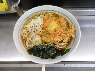 | 店舗内。すべて立席で収容は5名程度。由緒正しい立ち食いそば店といった風情です。 | 注文したのはかき揚げそば。早い、安い、うまいを体現する立ち食いそばも今や500円超えが当たります。時代の流れを感じます。 | |