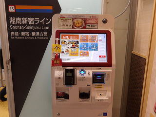 | 改札内の店舗外観。店舗は細長く、東側と南側二ヵ所に出入口が設置されています。 | 店舗外の券売機。前述の二か所の出入口にそれぞれ設置されています。 | |
