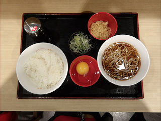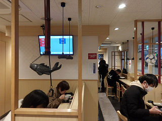 | 店舗内。すべて椅子席で収容は20名と少し。通路が狭く、少々窮屈に感じられます。 | 注文したのは朝定食。朝食はホテルで摂ることが多く、これを注文するのは初めてでした。 | |