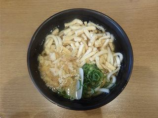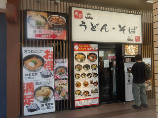 | 改札内店舗内。こちらも収容は5名と少し。中央には仕切りが設置され、改札外へのワープはできません。 | 注文したのはきざみうどん。あっさりした出汁には、どちらかと言えば甘辛い揚げのきつねの方が好みかな。 | |